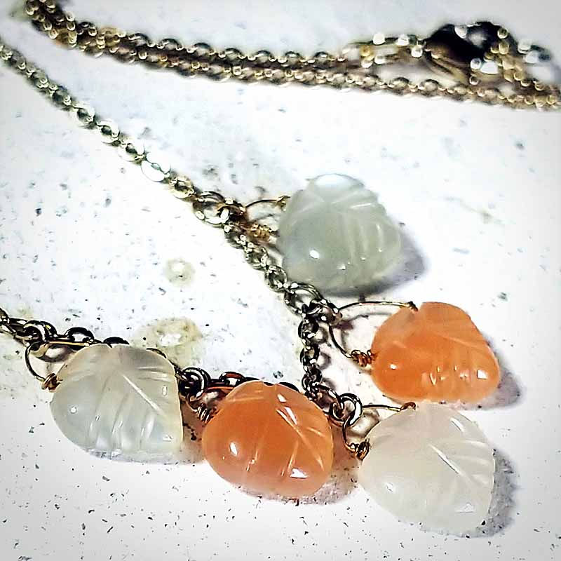 ホワイト&オレンジムーンストーンネックレス~小さな葉っぱ